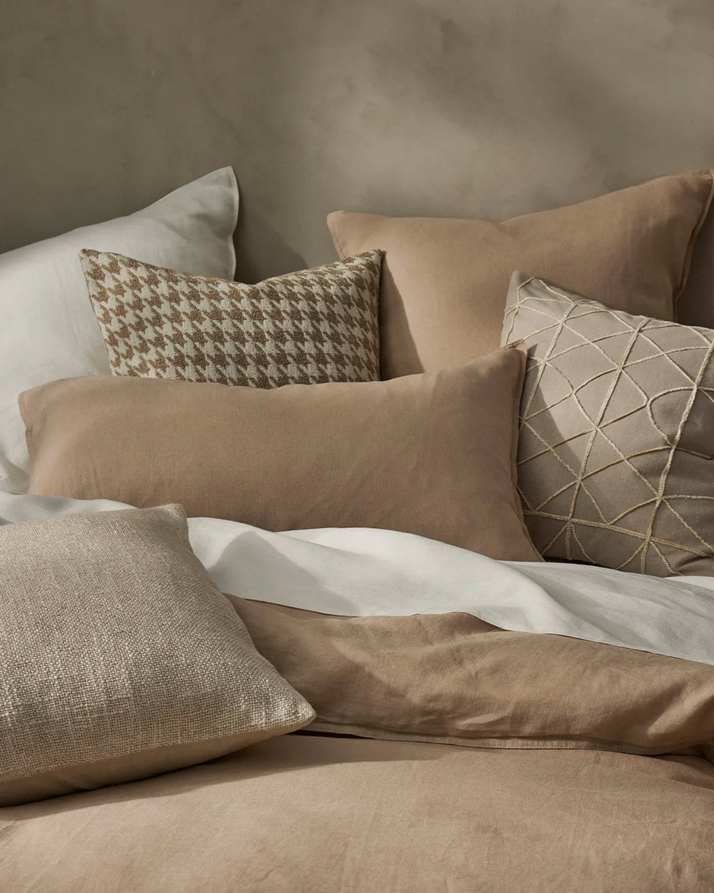 Queen beds: A pair of 55x55cm cushions works beautifully behind a pair of standard pillows, finished with a long lumbar cushion or smaller accents in front.