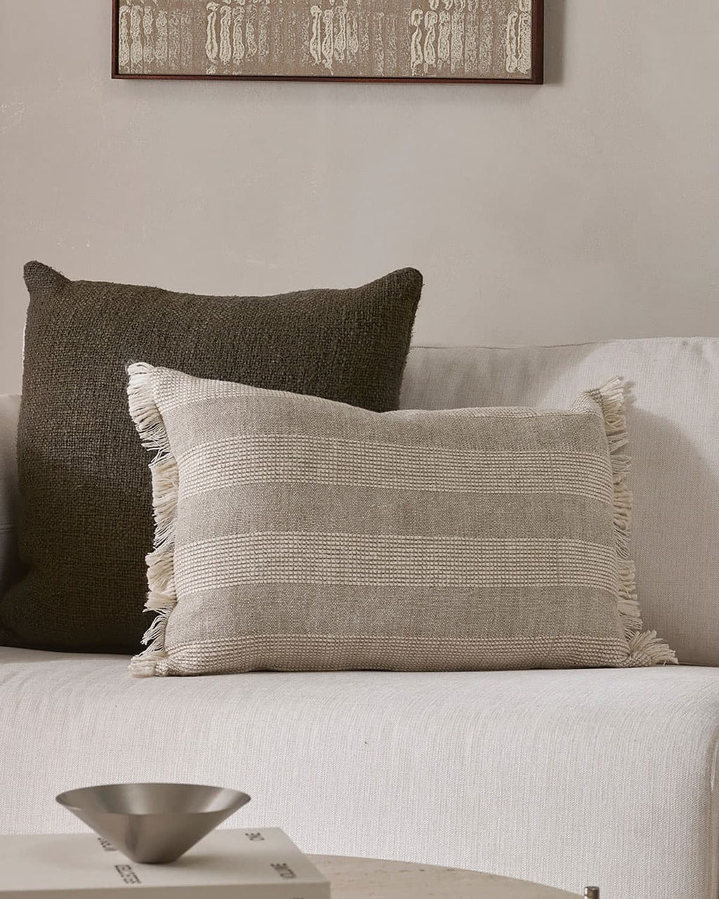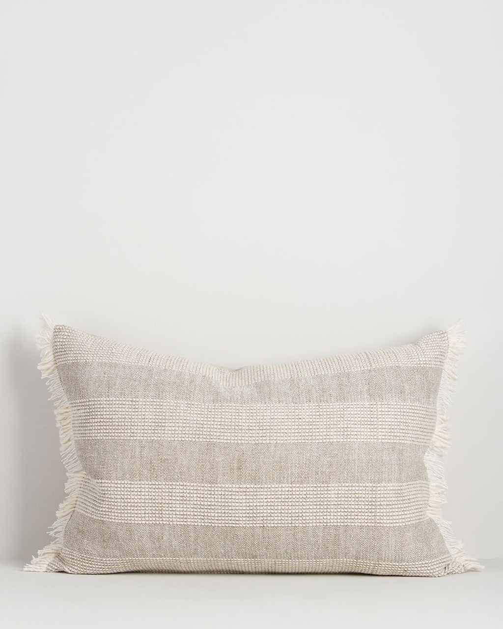 Add understated texture and warmth to your space with this beautifully crafted lumbar cushion. In a soft natural tone, the Carson's woven stripe design and fringed edges offer a relaxed yet refined feel - perfect for layering with tonal neutrals or contrasting deeper hues. Made from a linen-blend front and pure cotton back, the natural palette and subtle surface details create an elegant coastal aesthetic.
