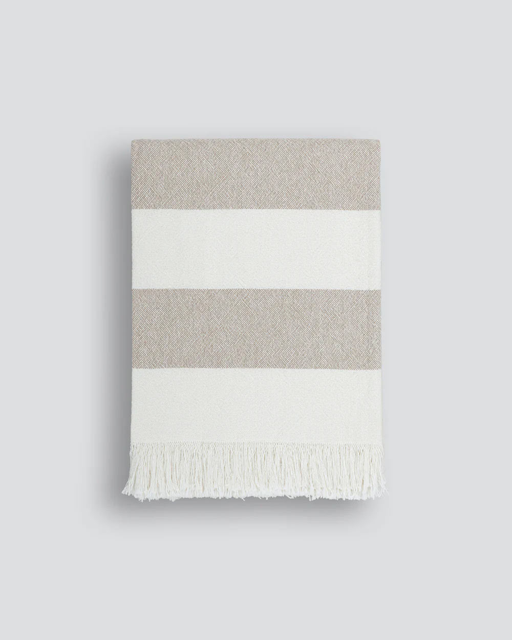 Capture the feeling of summer with the carefree aesthetic of this 100% cotton throw. Featuring a wide stripe design in a powdery pebble shade, the Cheltenham is cross woven with white and finished with frayed edge detailing. Inspiring memories of sun-drenched picnics and relaxed coastal living, this soft, medium-weight throw is the perfect summer accessory.