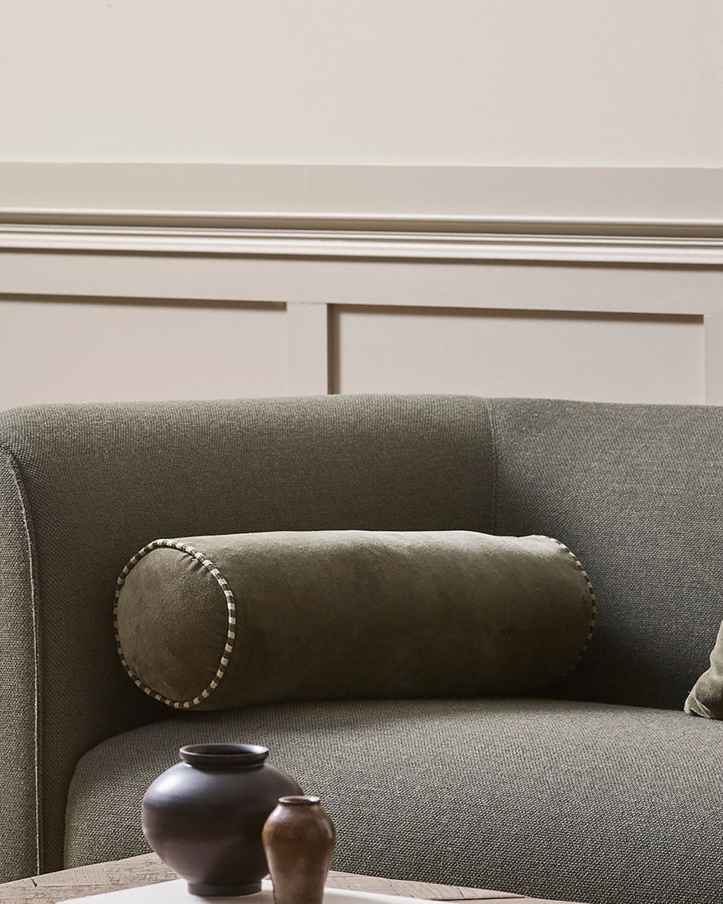Create an alluring, sophisticated space with the sculpted, cylindrical form of the Elliot bolster. Balancing softness and structure, plush dusky-green velvet is edged with striped linen piping for a piece that is both visually striking and inviting to touch. Designed to bring dimension and luxury to everyday living, Elliot pairs beautifully with the boxy silhouette of the Edward cushion - creating a layered aesthetic that feels timeless and considered.