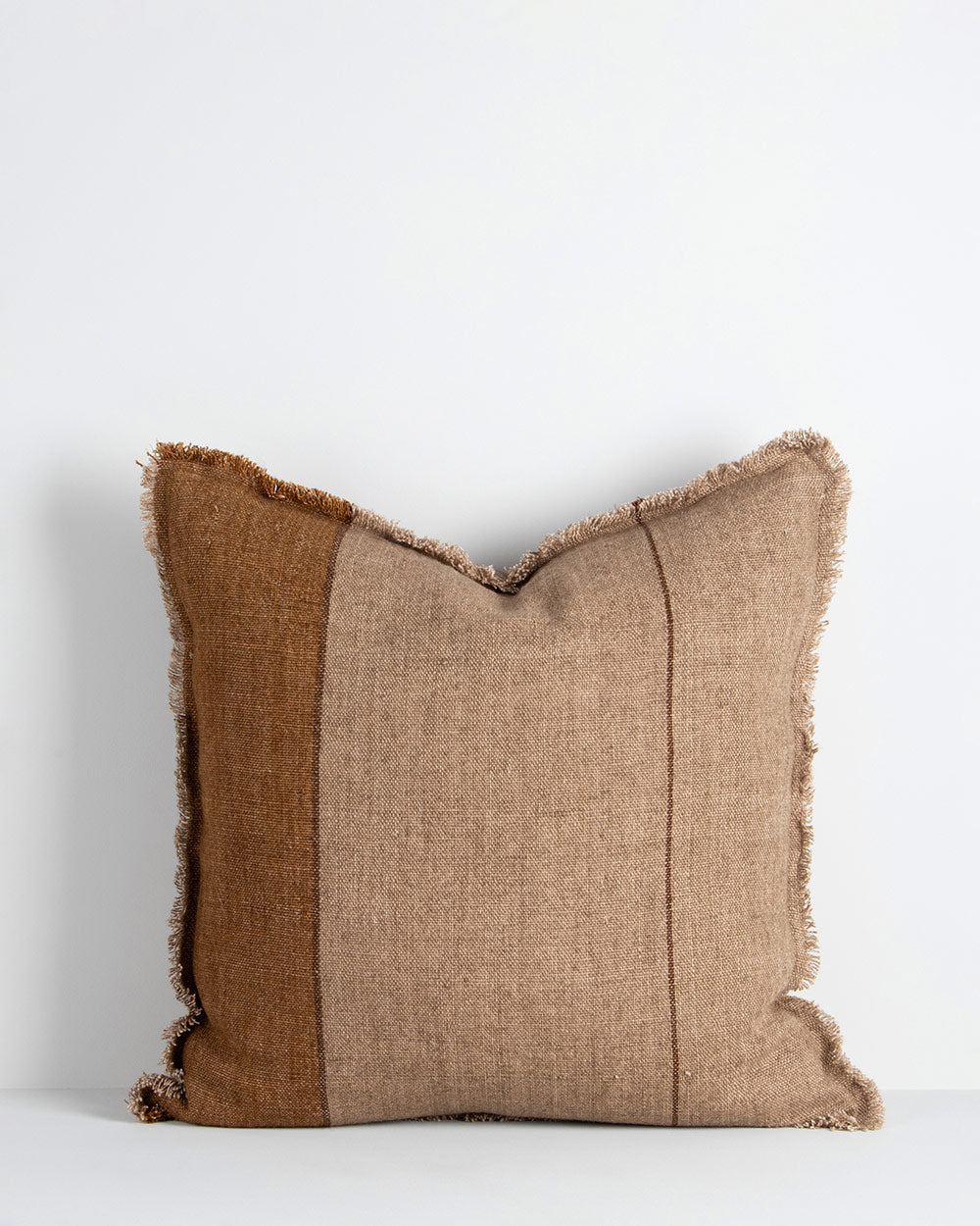 Country charm is given a contemporary twist with the raw fringing and warm caramel tones of Baya's Frankton cushion. Crafted from thick, textural linen, the asymmetric design creates a modern take on a classic style.