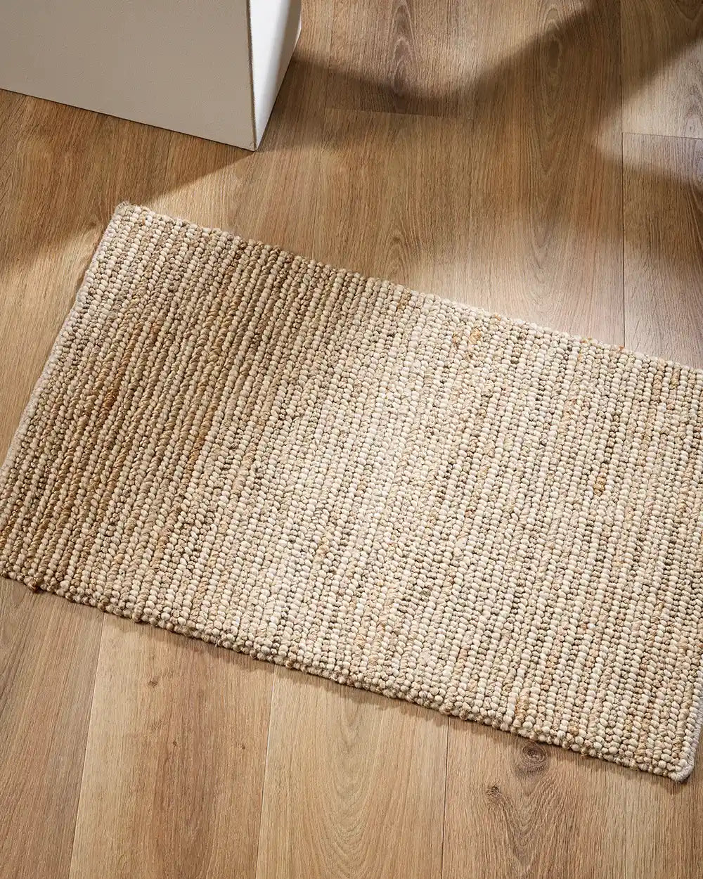 Create a welcoming entrance with this handwoven mat in light sand tones. Crafted from a blend of jute and wool, the design creates visual interest through raw texture and subtle patterning. The robust qualities of jute makes this piece hardwearing and excellent for high-traffic areas.
