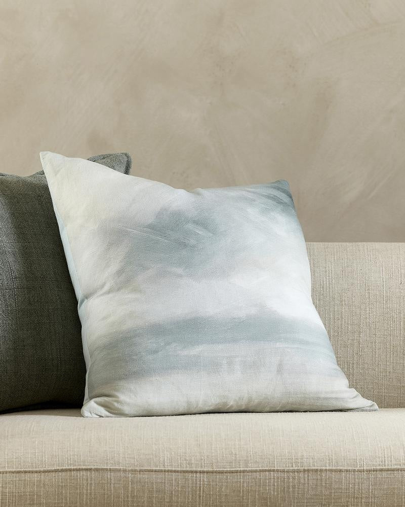 Hand-painted in soft brushstrokes, the Sunset cushion captures the essence of the ocean on a cotton/linen base. Featuring a calming palette of slate and off-white tones, the subtle design transforms spaces into elegant and tranquil retreats.