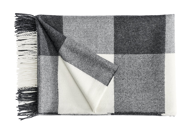 An exquisite throw, by Fischbacher 1819, in luxurious alpaca yarn. Alpaca fibre has an advantage over wool because of the extra hollow space in the fibre. This additional space creates a greater thermal capacity and allows for more warm air to fill the textile and provide extra warmth. This throw is incredibly soft and beautiful to touch, and is timeless in a black and white plaid. When something extra-special is called for, this throw is the perfect choice.