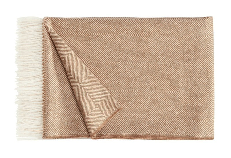 An exquisite throw, by Fischbacher 1819, in luxurious alpaca yarn. Alpaca fibre has an advantage over wool because of the extra hollow space in the fibre. This additional space creates a greater thermal capacity and allows for more warm air to fill the textile and provide extra warmth. This throw is incredibly soft and beautiful to touch, and is timeless in a camel brown chevron. When something extra-special is called for, this throw is the perfect choice.