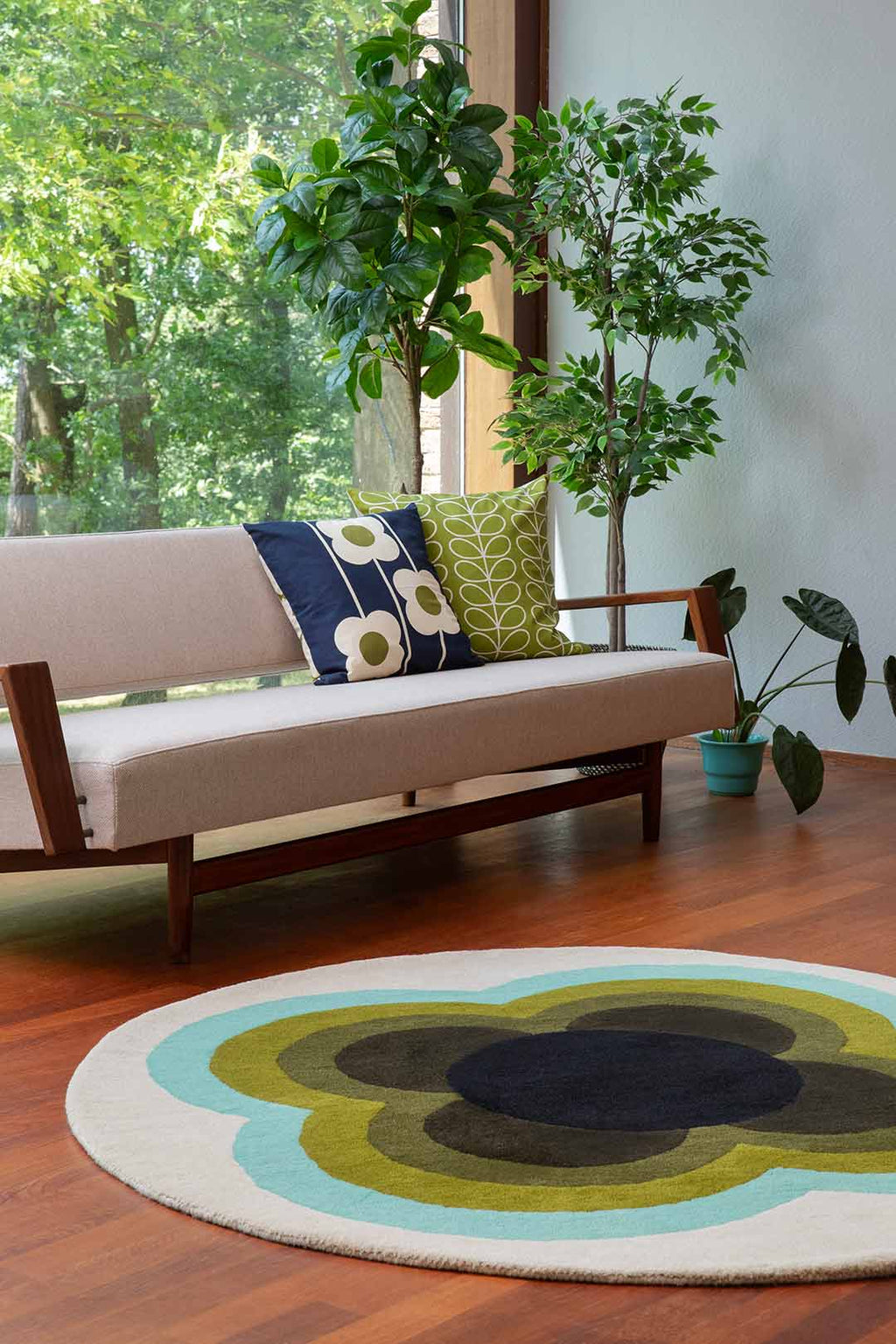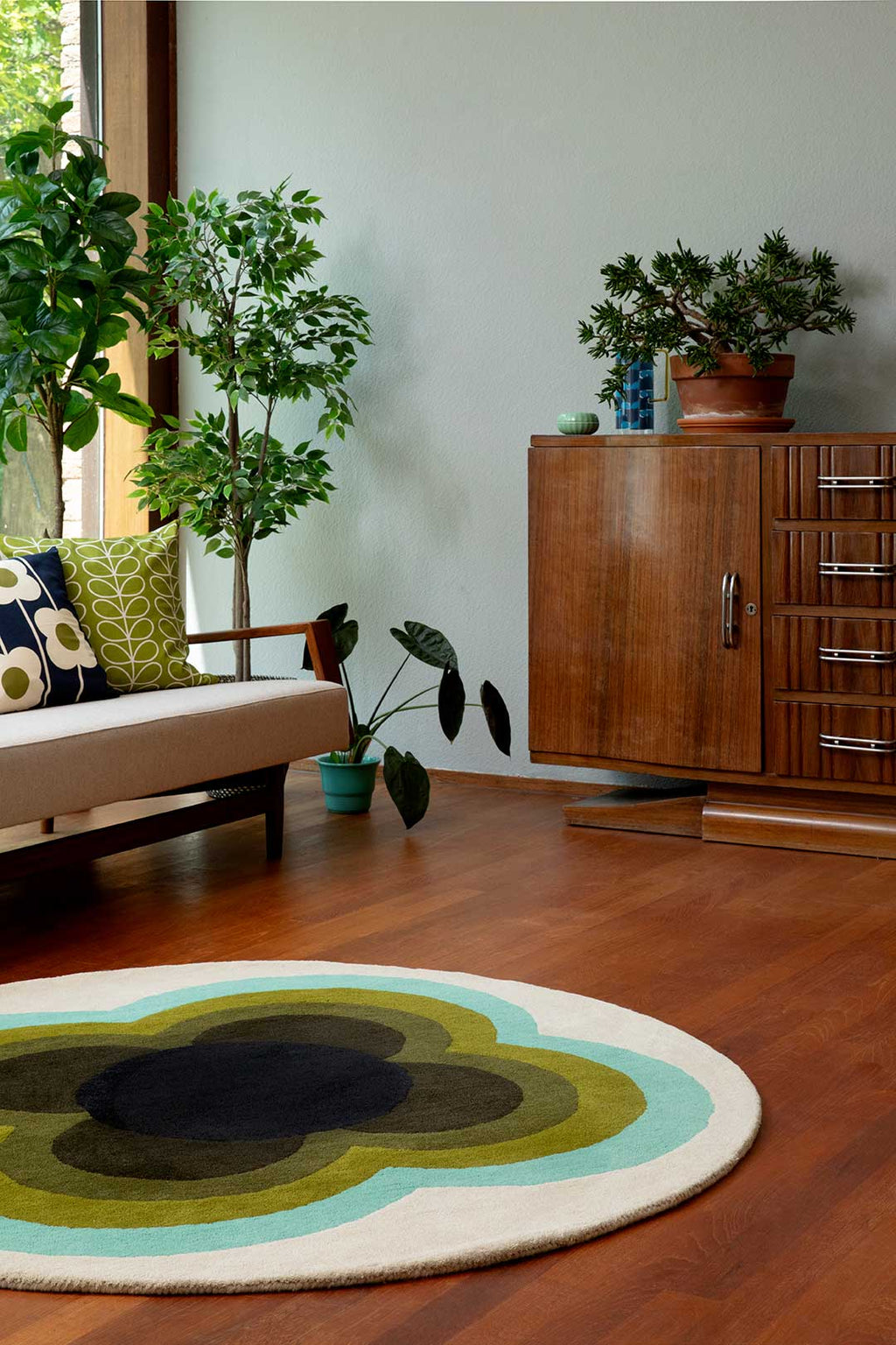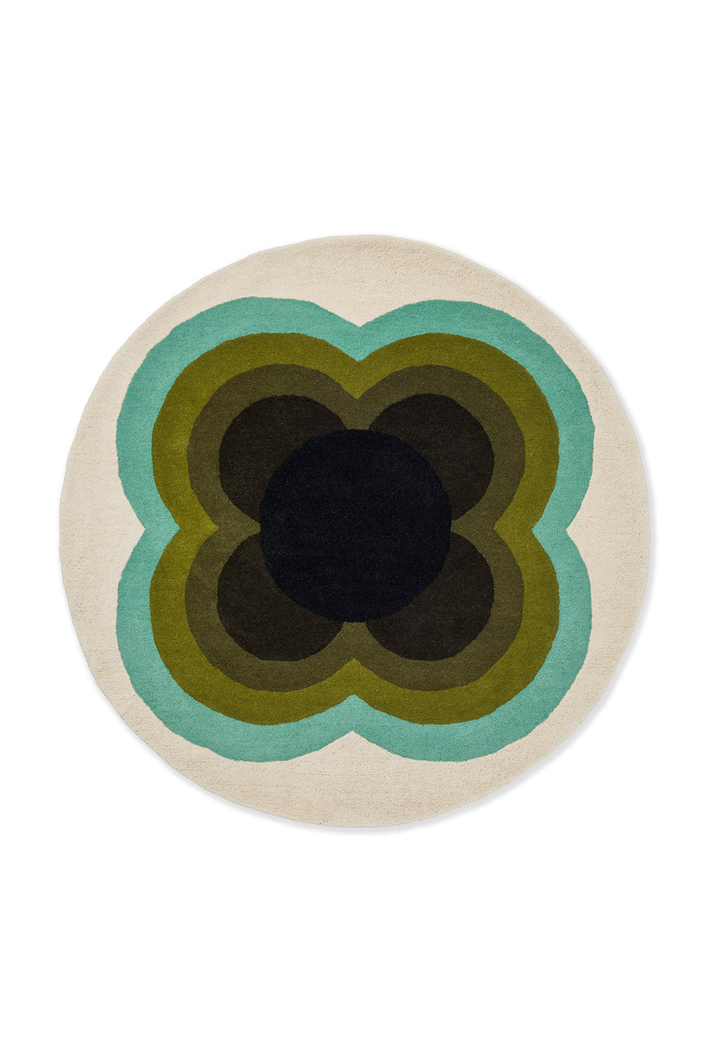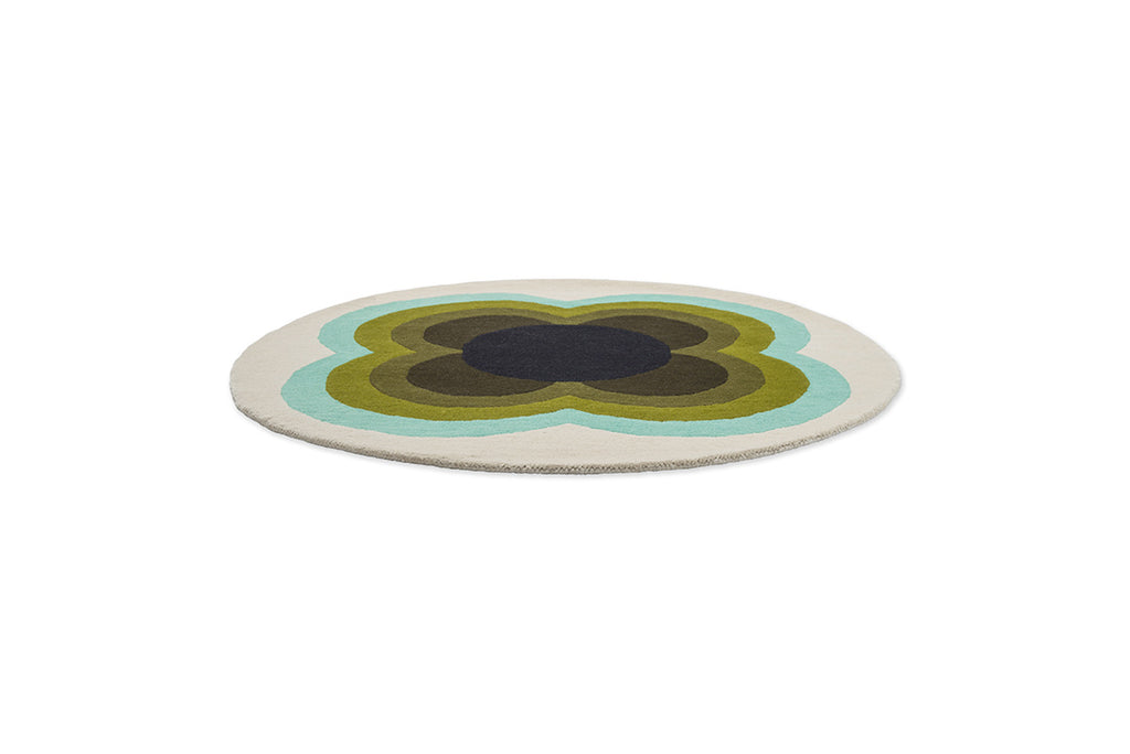 In the Sunflower Olive rug by Orla Kiely, her deep appreciation for mid-century design shines through. This round rug features a mesmerizing and rhythmic floral pattern, elegantly merging olive hues with subtle aqua and white accents, reflecting Kiely's journey of modernism built upon mid-century foundations.