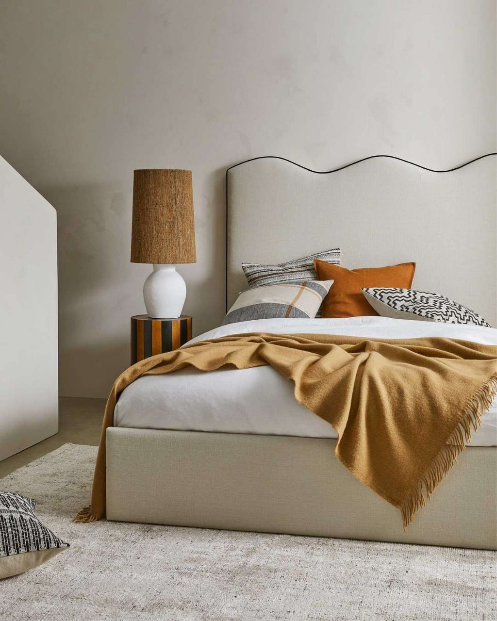 King beds: You can go up to 65x65cm Euro cushions or use three 50x50cm cushions across the bed for balance and impact.