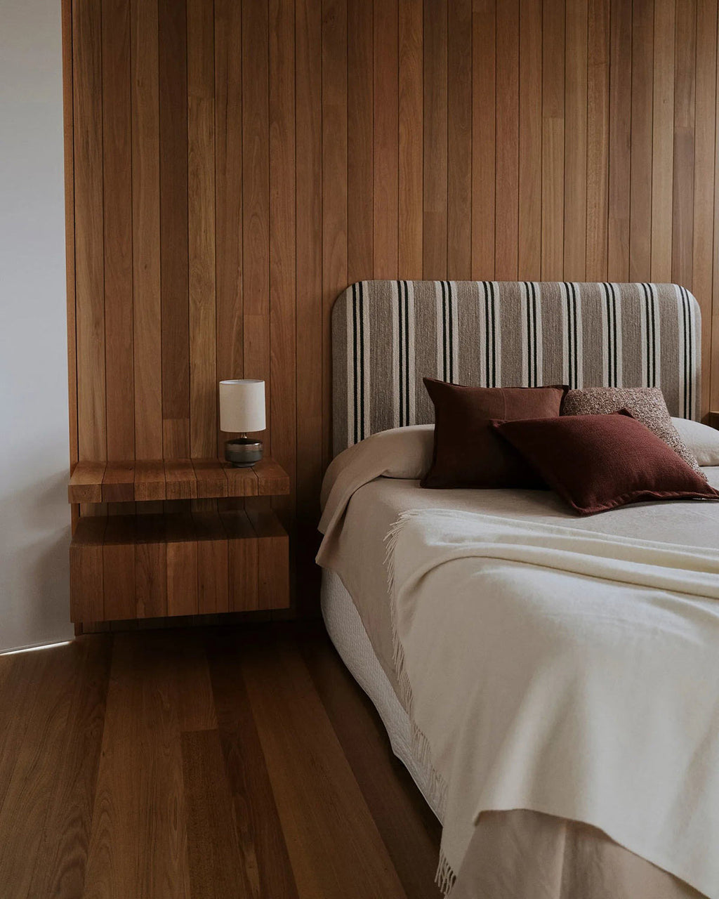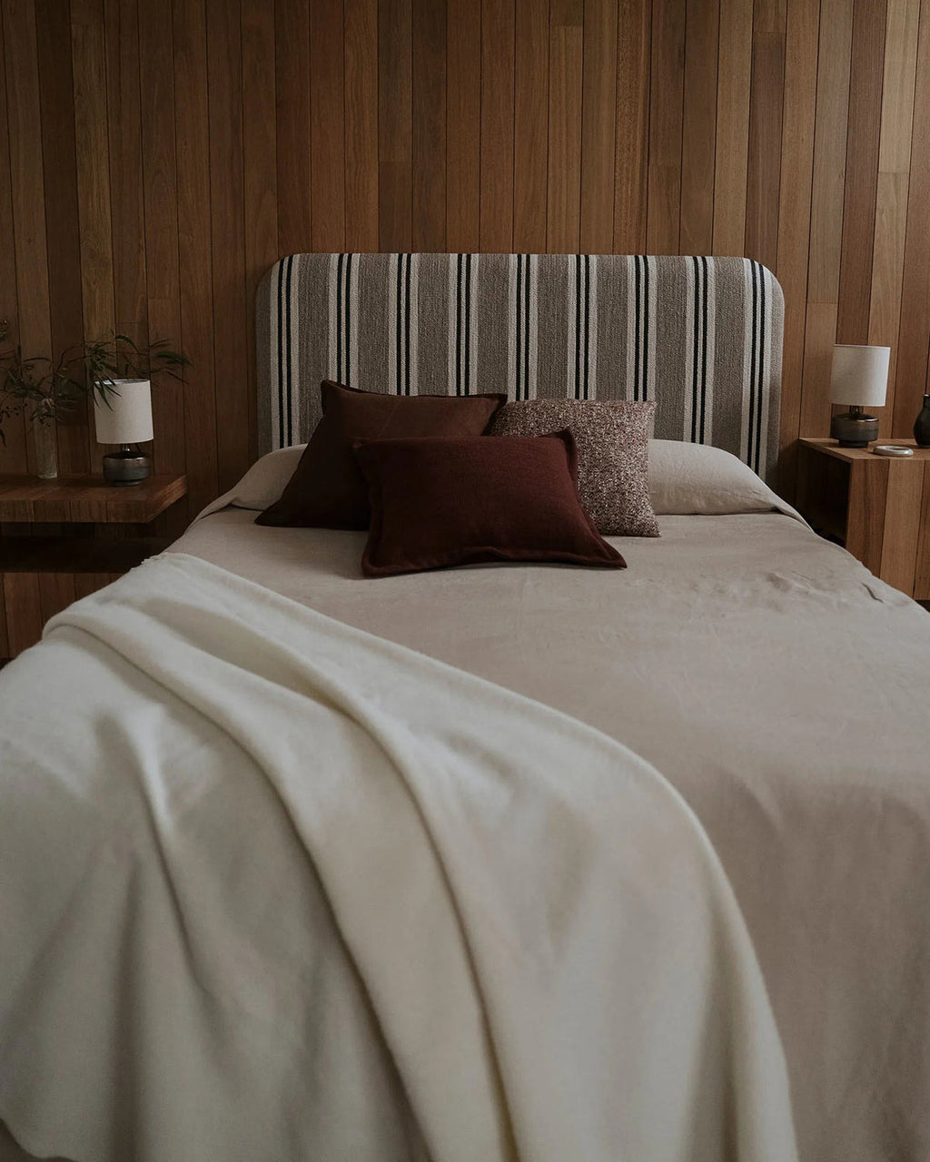 Queen beds: A pair of 55x55cm cushions works beautifully behind a pair of standard pillows, finished with a long lumbar cushion or smaller accents in front.