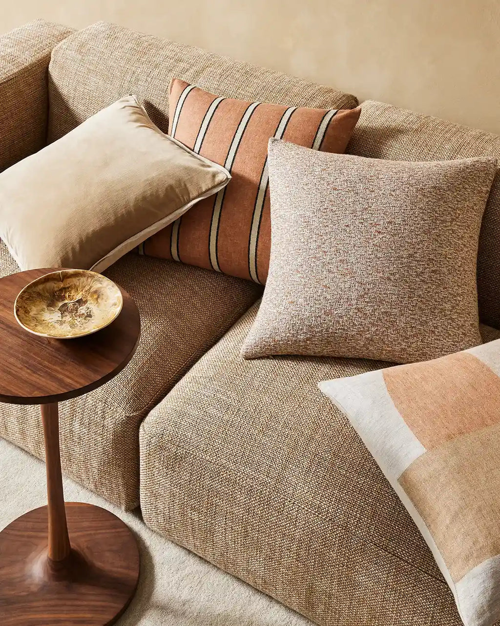 We recommend starting with 50x50cm (20"x20") or 55x55cm cushions—they're generously sized and create a plush, inviting look. Add a lumbar cushion (like 40x60cm or 30x50cm) in front for extra comfort and a layered effect. If your sofa is compact, consider using just smaller square or lumbar cushions to avoid crowding the space.